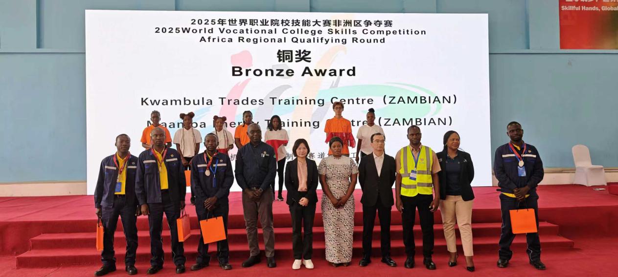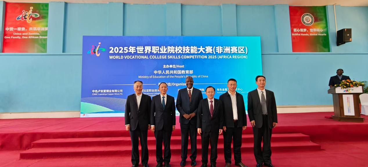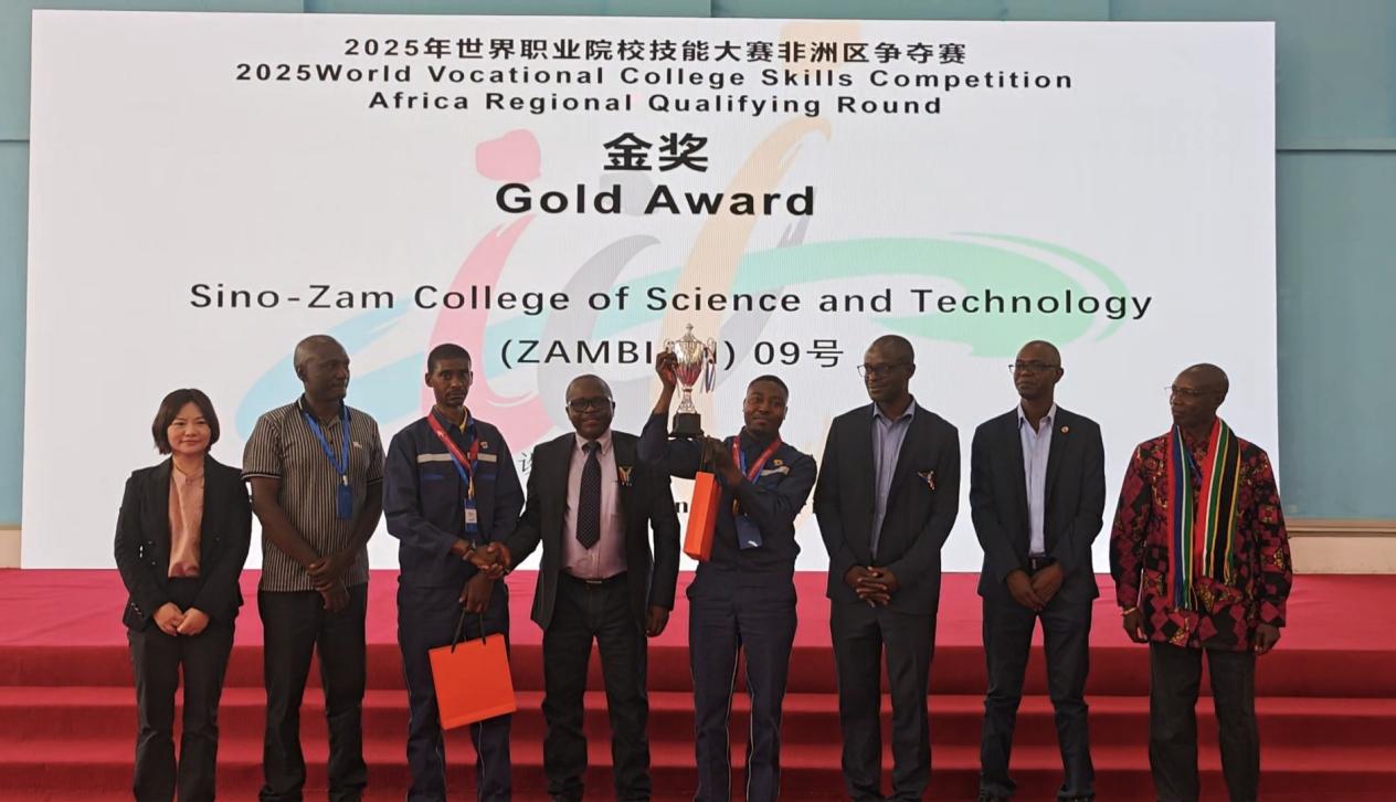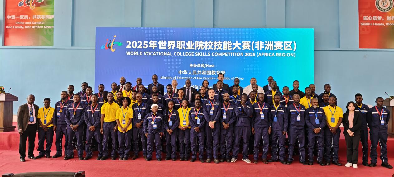 赞比亚当地时间9月6日上午,由中华人民共和国教育部联合国家多个部委和事业单位共同主办,北京市教育委员会、中国有色矿业集团、有色金属工业人才中心共同协办,中色卢安夏铜业有限公司、中国-赞比亚职业技术学院(以下简称“中赞职院”)、北京工业职业技术学院承办的“2025年世界职业院校技能大赛(非洲赛区)”闭幕式暨颁奖仪式在赞比亚卢安夏市——中国-赞比亚职业技术学院举行。本次大赛聚焦机械设计与制造、机电设备安装与运维两大核心赛道,自9月5日开幕以来,吸引了来自南非、尼日利亚、坦桑尼亚、赞比亚28支参赛队伍近60名选手同台竞技。经过激烈角逐,最终评选出金奖2个、银奖4个和铜奖6个。来自赞比亚——中国-赞比亚职业技术学院代表队,包揽机电设备安装与运维赛道(电工)、机械设计与制造赛道(钳工)两个项目的金牌。我校机电工程学院与赞方教师紧密合作,从竞赛方案制定、专业技术学习到技能操作训练,全过程悉心指导中赞职业技术学院学生备赛。