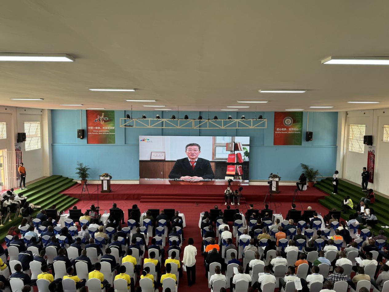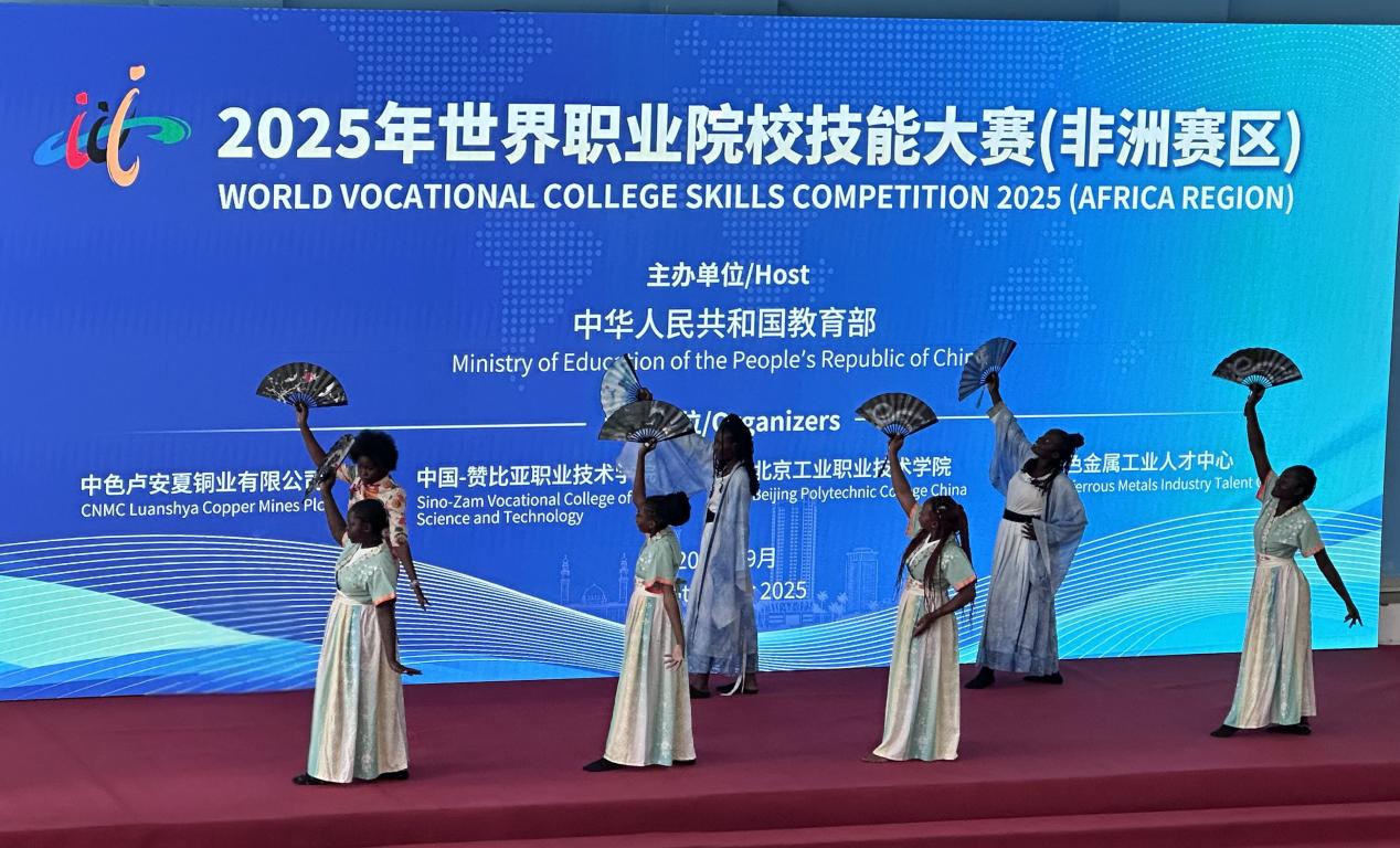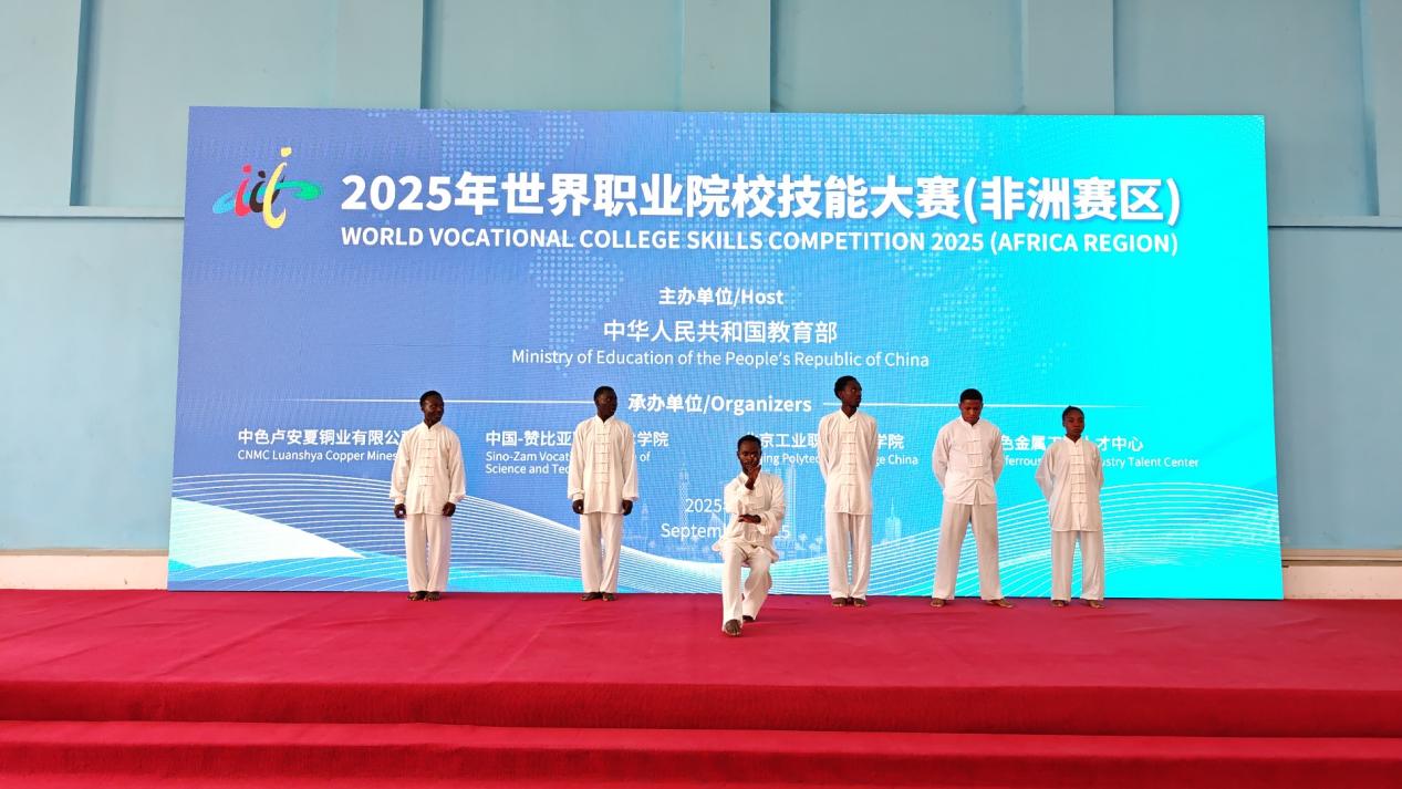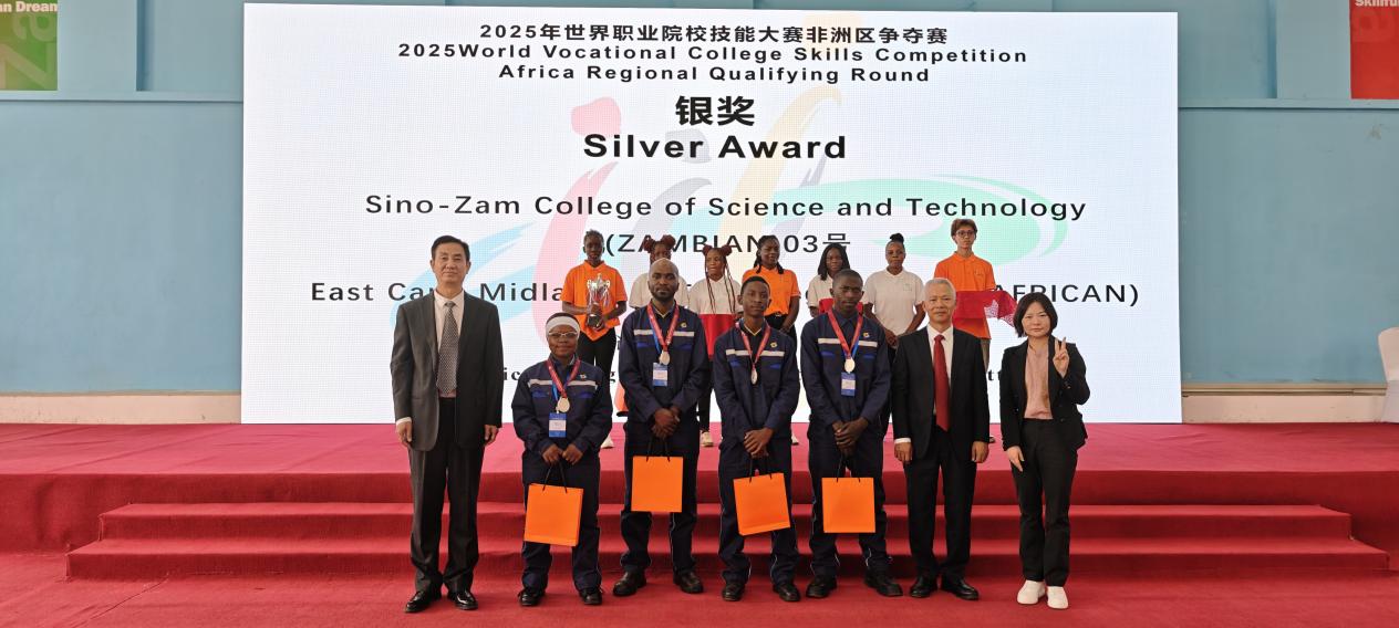 赞比亚当地时间9月6日上午,由中华人民共和国教育部联合国家多个部委和事业单位共同主办,北京市教育委员会、中国有色矿业集团、有色金属工业人才中心共同协办,中色卢安夏铜业有限公司、中国-赞比亚职业技术学院(以下简称“中赞职院”)、北京工业职业技术学院承办的“2025年世界职业院校技能大赛(非洲赛区)”闭幕式暨颁奖仪式在赞比亚卢安夏市——中国-赞比亚职业技术学院举行。本次大赛聚焦机械设计与制造、机电设备安装与运维两大核心赛道,自9月5日开幕以来,吸引了来自南非、尼日利亚、坦桑尼亚、赞比亚28支参赛队伍近60名选手同台竞技。经过激烈角逐,最终评选出金奖2个、银奖4个和铜奖6个。来自赞比亚——中国-赞比亚职业技术学院代表队,包揽机电设备安装与运维赛道(电工)、机械设计与制造赛道(钳工)两个项目的金牌。我校机电工程学院与赞方教师紧密合作,从竞赛方案制定、专业技术学习到技能操作训练,全过程悉心指导中赞职业技术学院学生备赛。